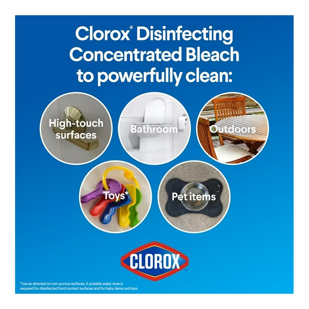 Clorox® Disinfecting Bleach, the bleach you’ve known and trusted for generations with the power to clean, whiten, disinfect, and kill bacteria and viruses. Clorox® Disinfecting Bleach makes stain removal easier. The easy to handle bottle allows you to grip the handle and pour without the mess of spillage. Clorox® Disinfecting Bleach works with both traditional and high-efficiency washing machines. For a healthy home and to keep whites at their whitest use Clorox® Bleach. Use as directed.
