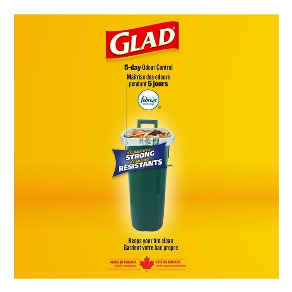 Glad® Certified Compostable Fresh Lemon Scent bags keep your compost bin clean and your kitchen smelling fresh. OdourShield technology continuously neutralizes food odours and keeps your home smelling fresh with a pleasant lemon scent. Glad Compost bags meet the requirements of municipal compost programs, ASTM D6400 standards and are certified compostable by the industry standards authority, BPI and BNQ. Glad® Compost Bags will compost completely, quickly, and safely in a municipal composting facility just like paper, yard trimmings, and food scraps. GLAD. Guaranteed Strong.
