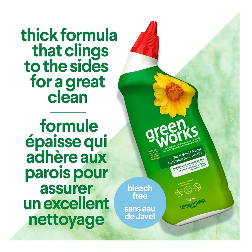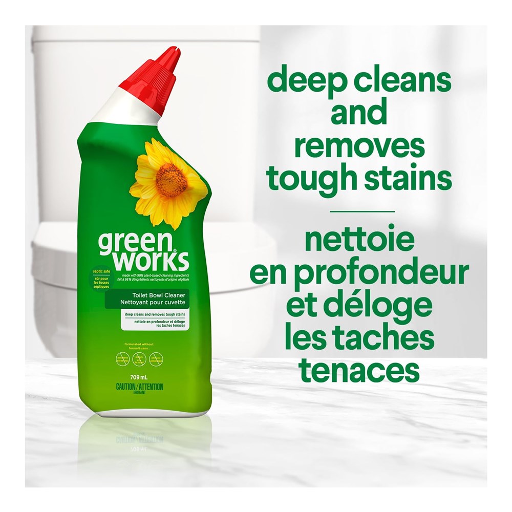 Naturally-derived 99% Removes tough stains Contains no phosphorus. Contains no bleach. Green Works® naturally-derived toilet bowl cleaner easily removes tough stains such as rust, minerals and hard-water deposits, and is still safe for plumbing and septic systems. When you use Green Works® products, you get naturally-derived cleaners that really work. We believe that naturally-derived cleaners should be accessible, effective and affordable for everyone. Our products combine powerful cleaning performance with naturally-derived and plant-based ingredients. With Green Works® products, you can expect: - A cleaning experience without any harsh chemical fumes or residue - Biodegradable cleaning ingredients* - Products that are never tested on animals *Cleaning ingredients will biodegrade when disposed of down the drain. From the makers of Clorox® products.