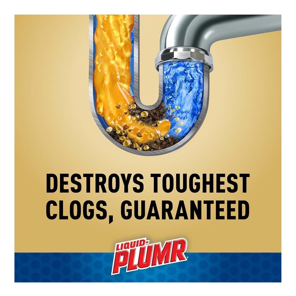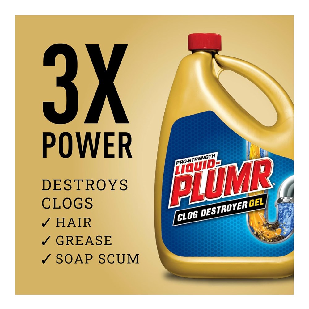 Liquid-Plumr® Full Clog Destroyer® is a powerful drain cleaner that is specially formulated to take on the toughest clogs. The thick gel holds together to cut through standing water and attack built-up hair, soap scum and gunk. It gets to work fast, eliminating stubborn blockages and leaving your drain free-flowing and clog-free. Full Clog Destroyer® is safe for all septic systems and pipes, including PVC, plastic, copper and old pipes. Keep your drains clear with Liquid-Plumr®.
