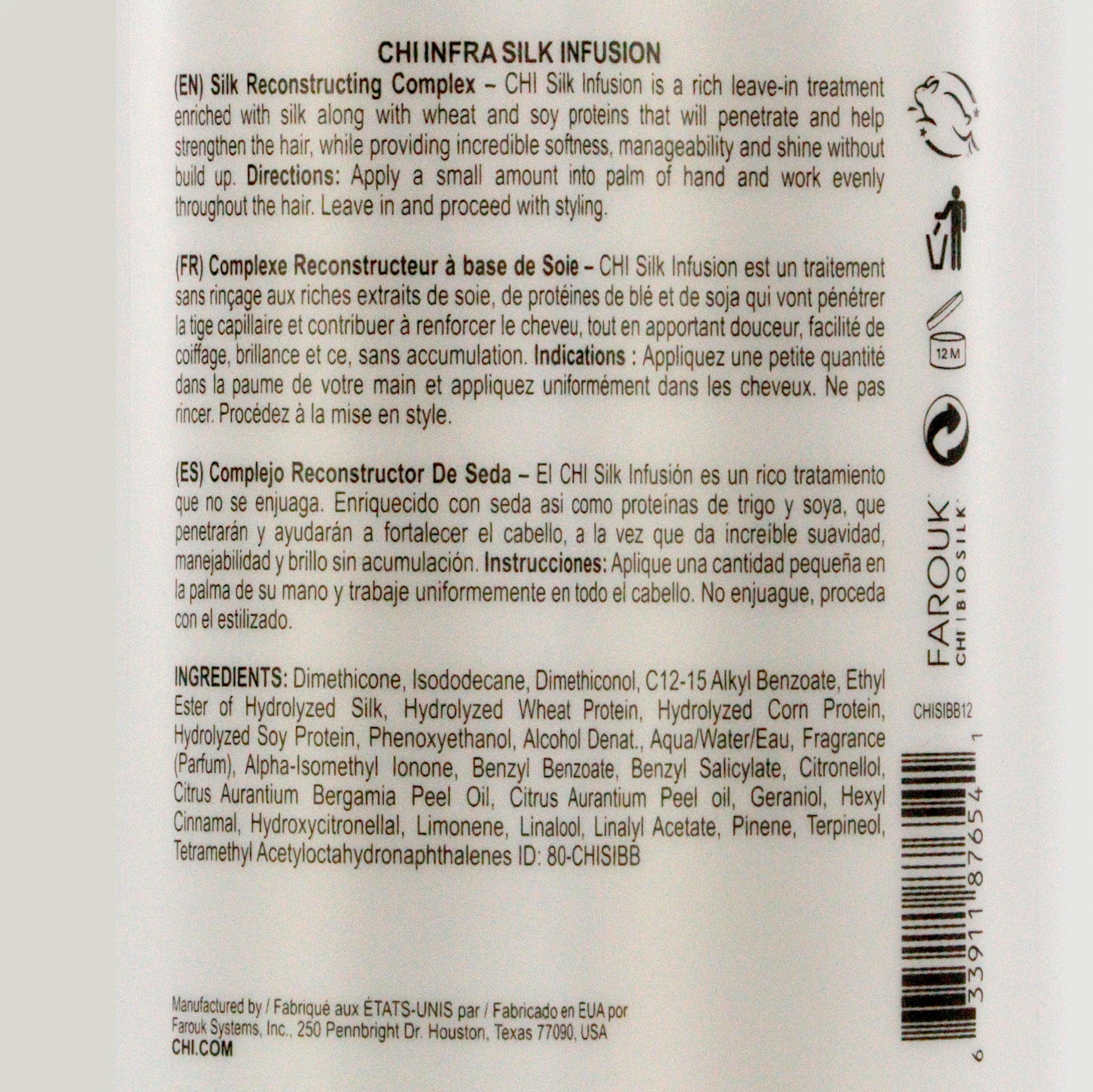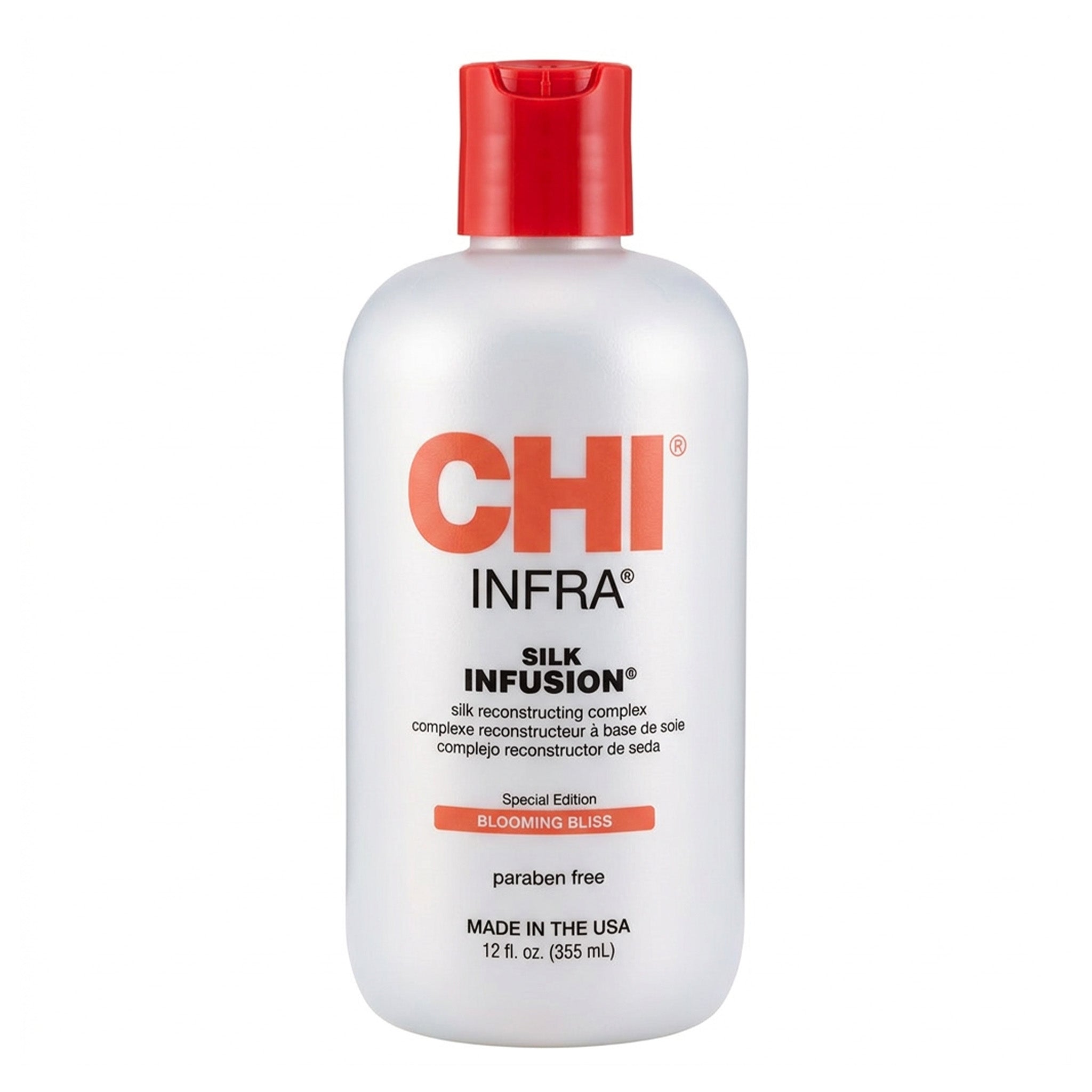 CHI Infra Blooming Bliss Silk Infusion is a rich, leave-in treatment enriched with silk, wheat, and soy proteins that work to strengthen and protect the hair. This limited-edition Blooming Bliss version features a refreshing floral scent while providing the same legendary performance CHI is known for. It helps to reconstruct damaged hair, infusing it with incredible shine and softness without any heavy buildup.