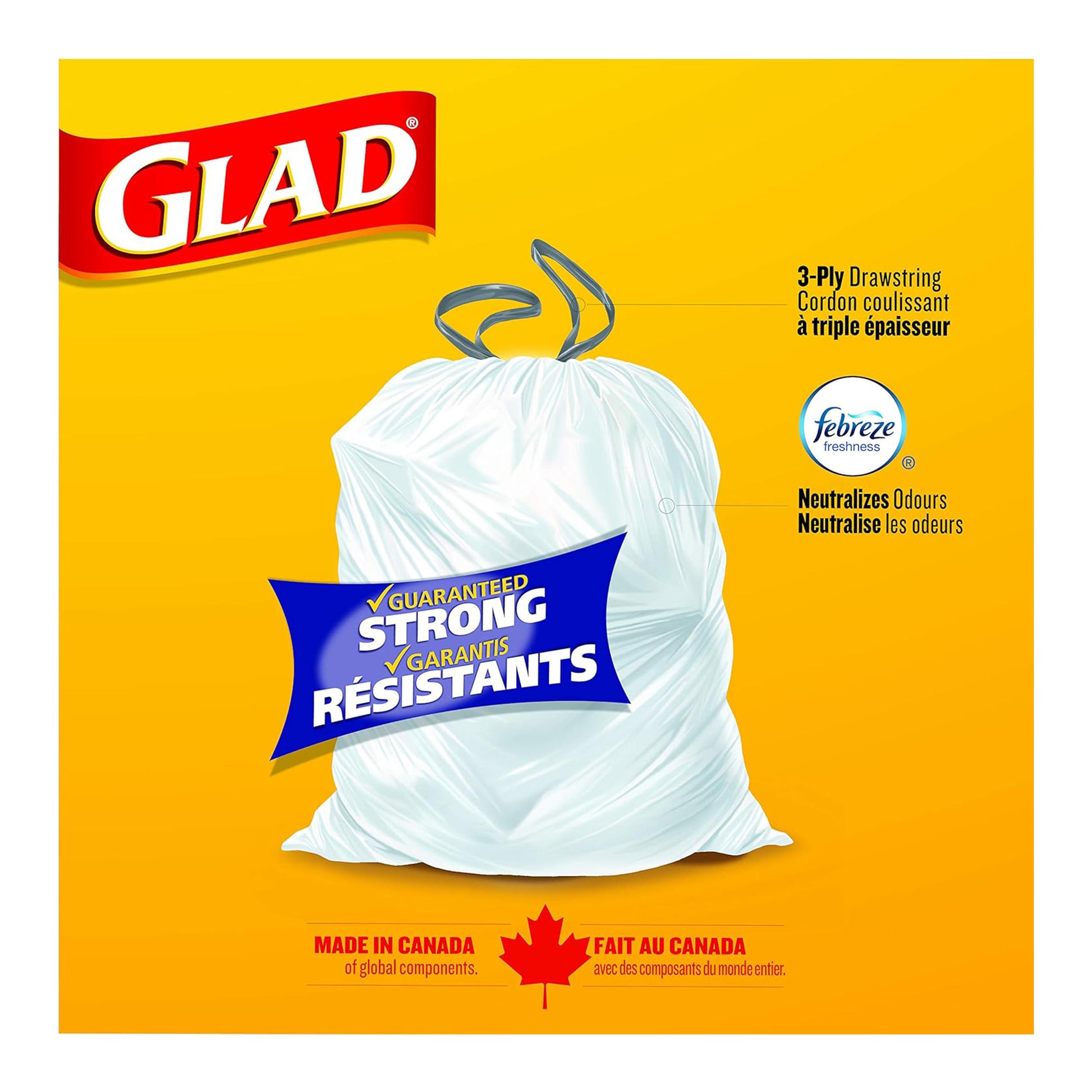 GLAD ForceFlex Drawstring Garbage Bags are designed for everyday household waste with added strength and flexibility. Featuring ForceFlex technology, the bags stretch to help prevent rips and tears while handling bulky or sharp trash. The drawstring closure allows for easy lifting, tying, and carrying while keeping garbage securely contained.
