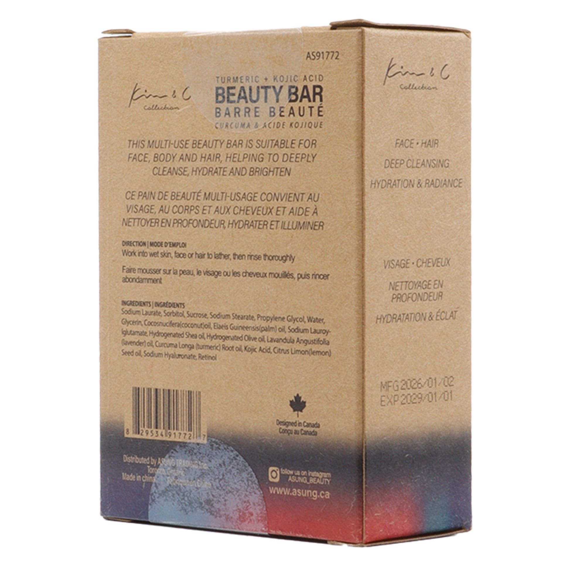 Experience the ultimate skin-brightening multi-tasker with the Kim & C Turmeric + Kojic Acid Beauty Bar. This 5.5oz "Soap & Shampoo Bar" is a powerhouse formula designed to address dullness and uneven skin tone from head to toe. By combining two of nature’s most celebrated brightening agents—Turmeric and Kojic Acid—with high-performance skincare actives like Retinol and Hyaluronic Acid, this bar deeply cleanses while promoting a radiant, hydrated complexion. It is the perfect all-in-one solution for those looking to simplify their routine without sacrificing results.